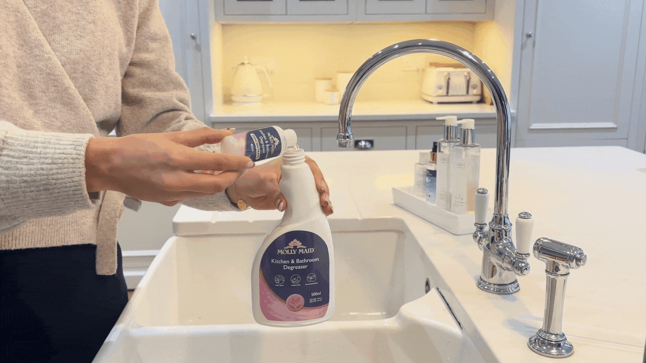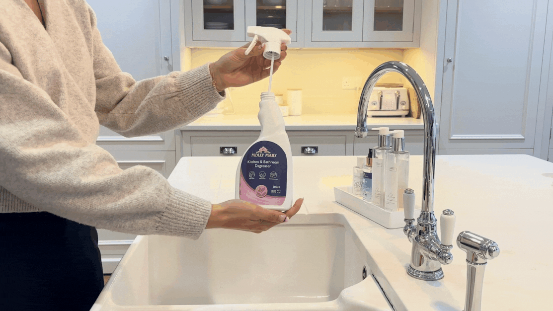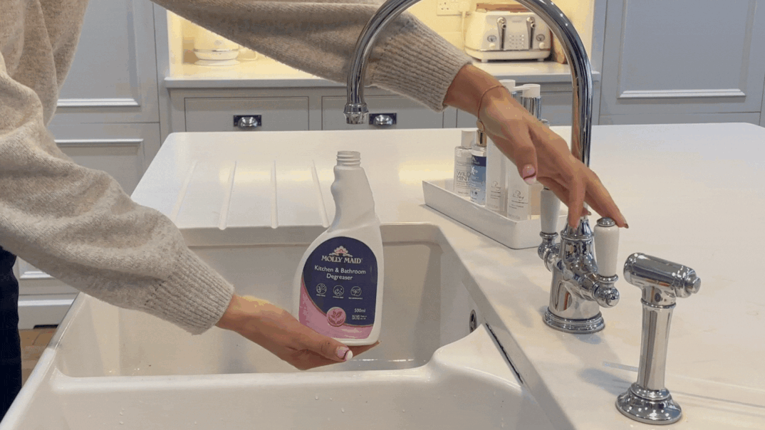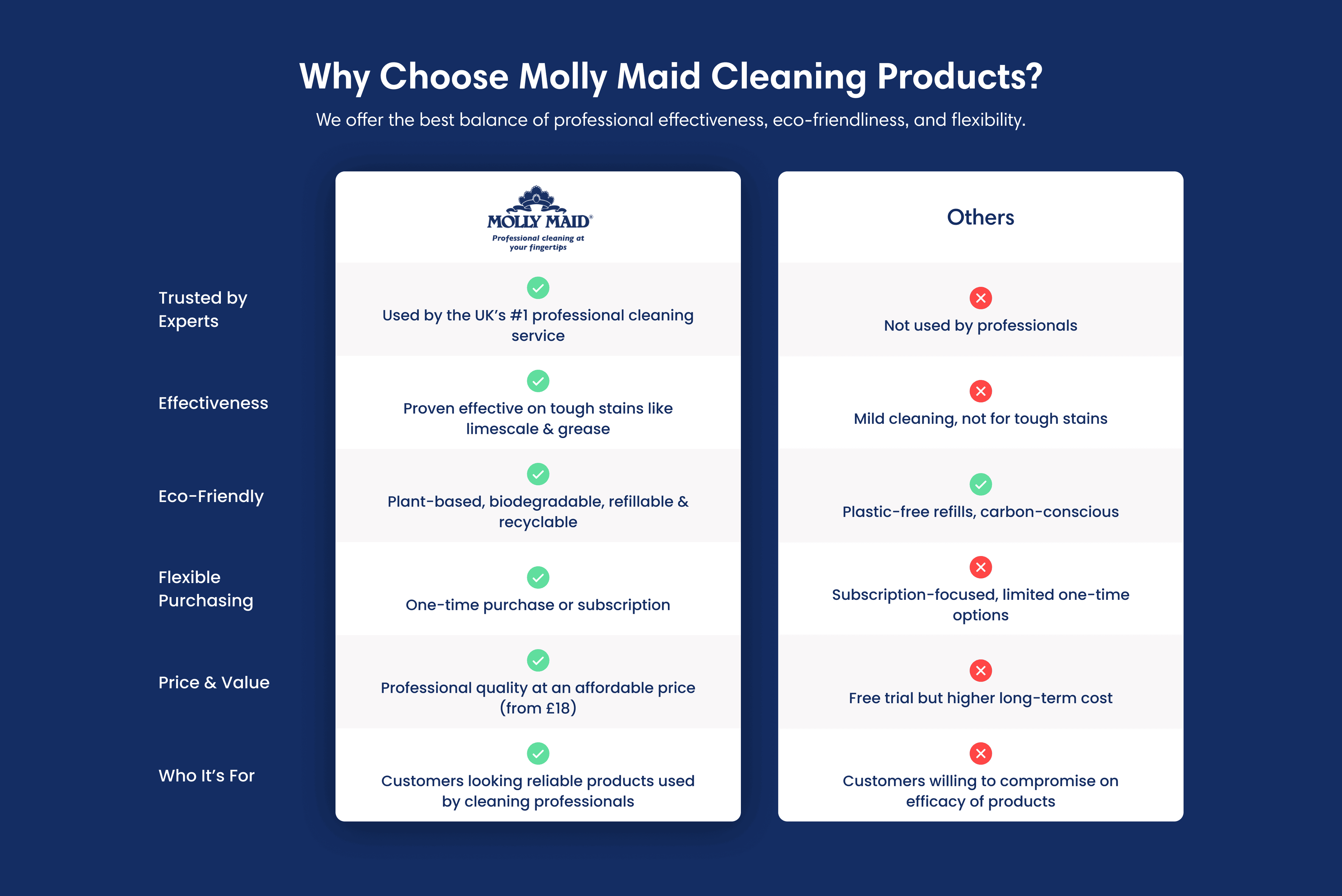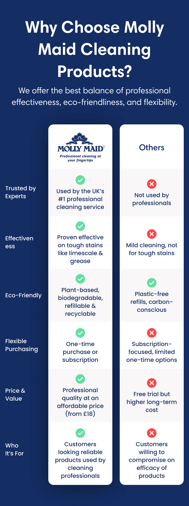 Our Limescale Remover, used alongside our specialist agitator cleaning cloth, effectively eliminates hard water and limescale deposits while being safer for you, your surfaces, and the environment. Molly Maid cleaners, who have cleaned over 10 million homes in the UK, swear by it as the best and safest limescale remover they've ever used.